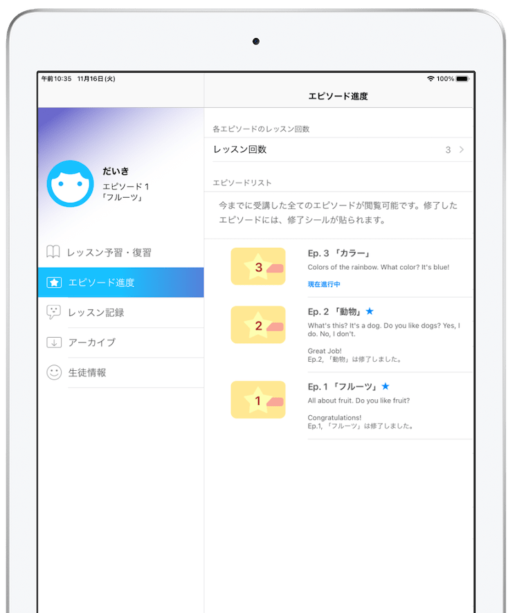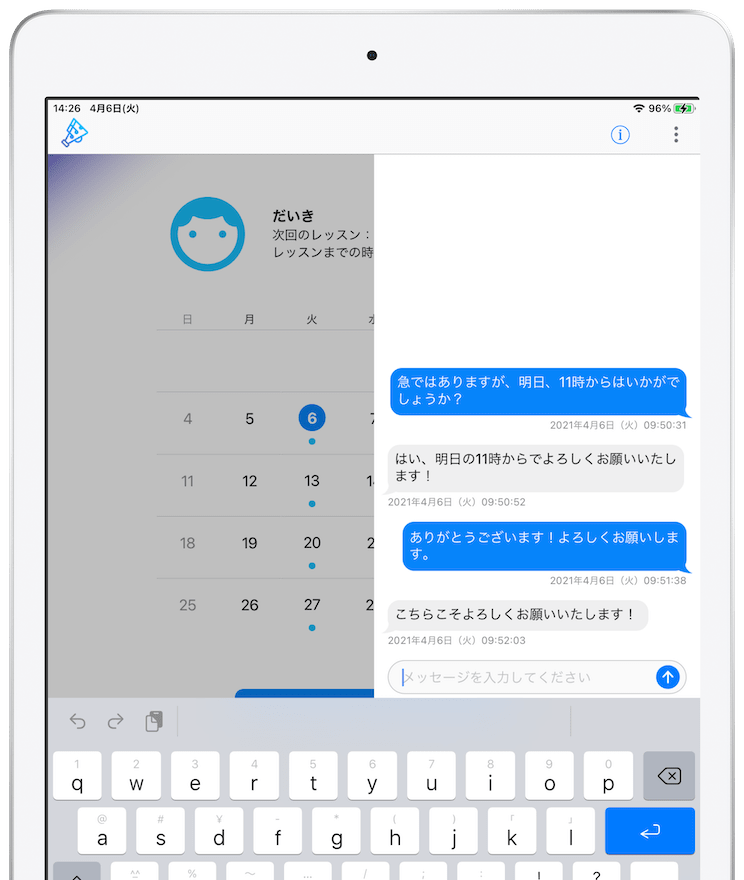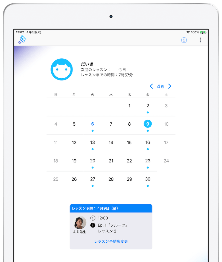 アプリからいつでも、お子様のレッスンスケジュールを簡単に編集したり、先生からの『レッスン記録』を読んだり、お子様の進捗状況も簡単チェックできる仕組みです。